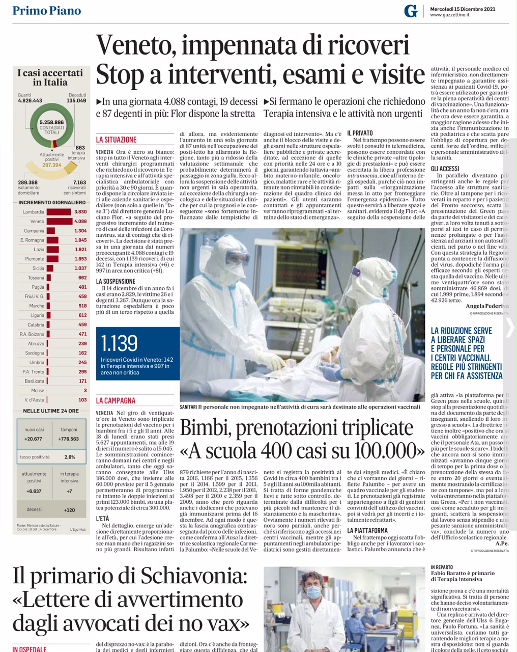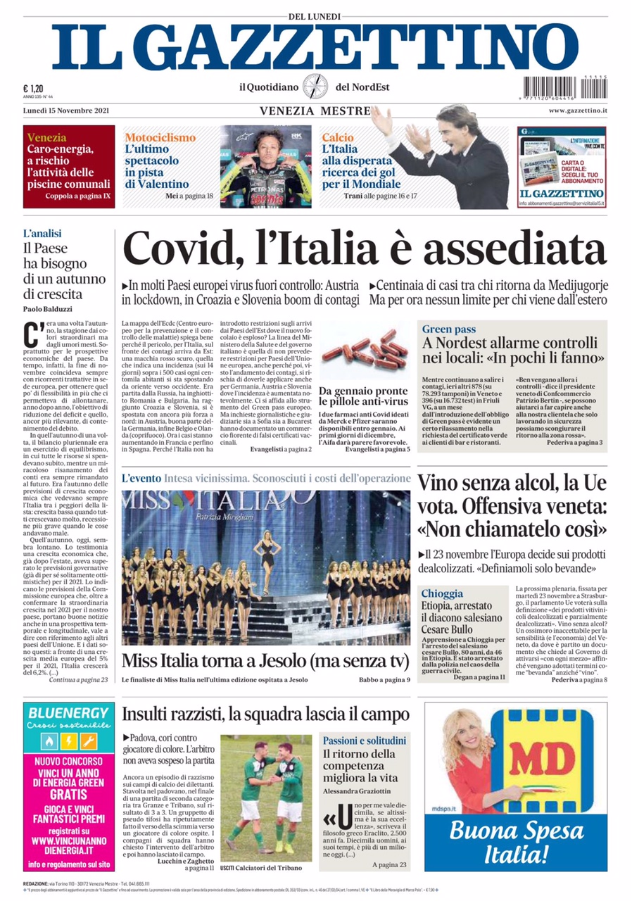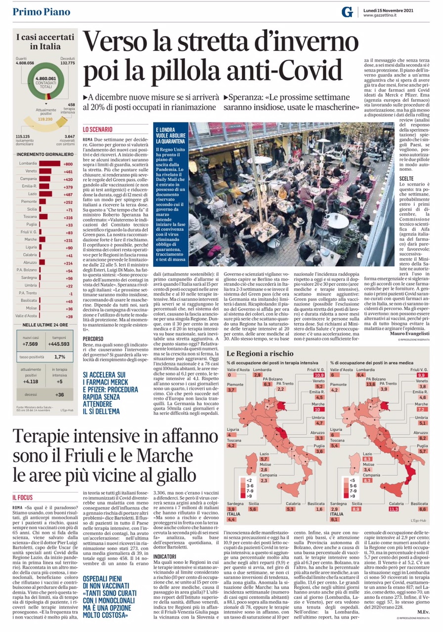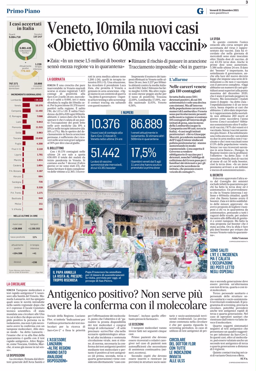 Per la cronaca, sempre sul Gazzettino, su dati del Ministero della Salute, i casi accertati di incremento giornaliero nel Veneto in data 15 dicembre 2021 erano +4.088 al giorno, quindici giorni dopo al 31 dicembre 2021 siamo arrivati a +10.376, il 15 novembre 2021 eravamo a +461 - quattrocentosessantuno - e il titolo di testa era “Covid, l’Italia è assediata" (allegato).