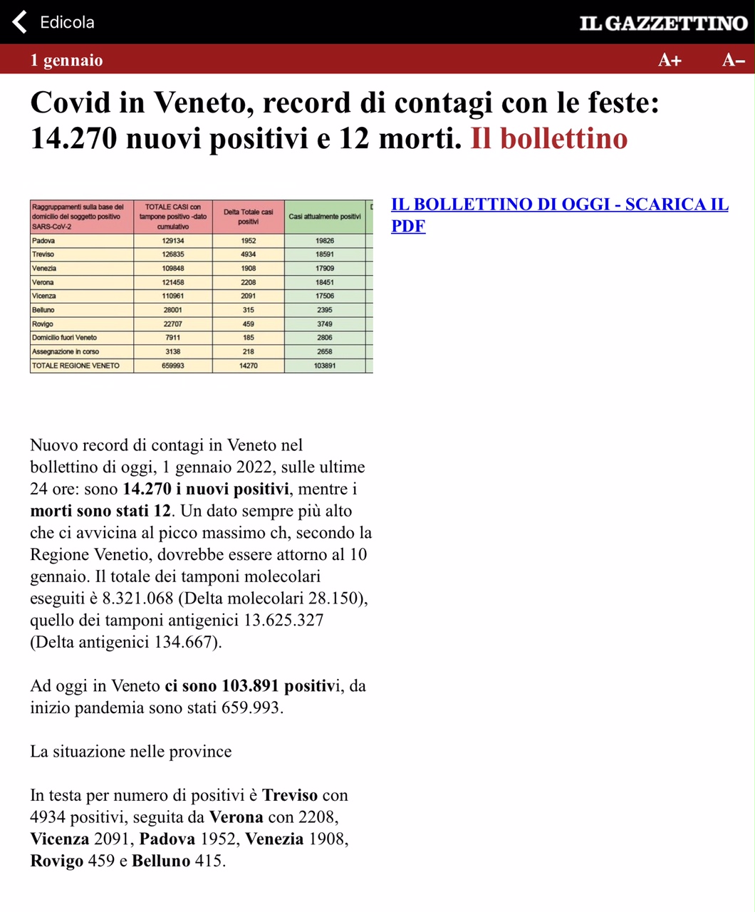 Perché il bollettino di oggi, 1 gennaio, sempre del Gazzettino riferisce +14.270 positivi (allegato). E in una situazione del genere nei fatti accusiamo i medici ed i pediatri di nullafacenza a fronte di tutto il carico di lavoro aggiuntivo che si somma alla routine delle altre patologie, perché ricordo che esistono anche quelle, che si somma all’ondata di richieste specifiche Covid nei vari ambulatori?