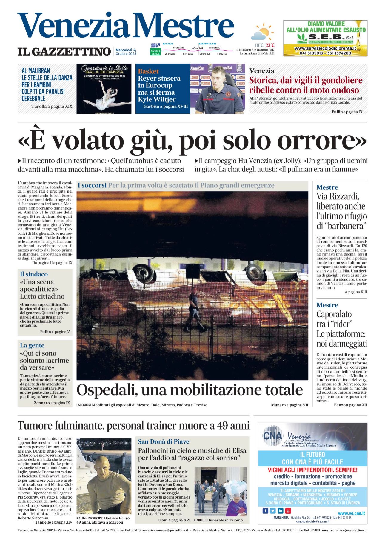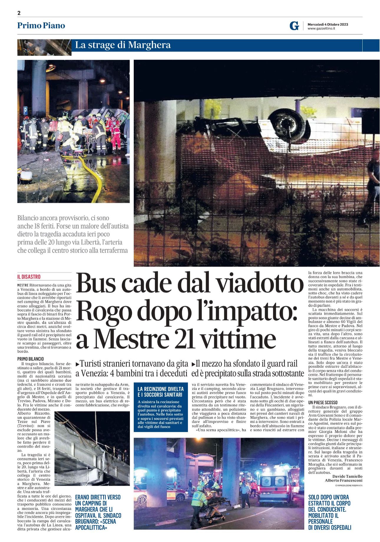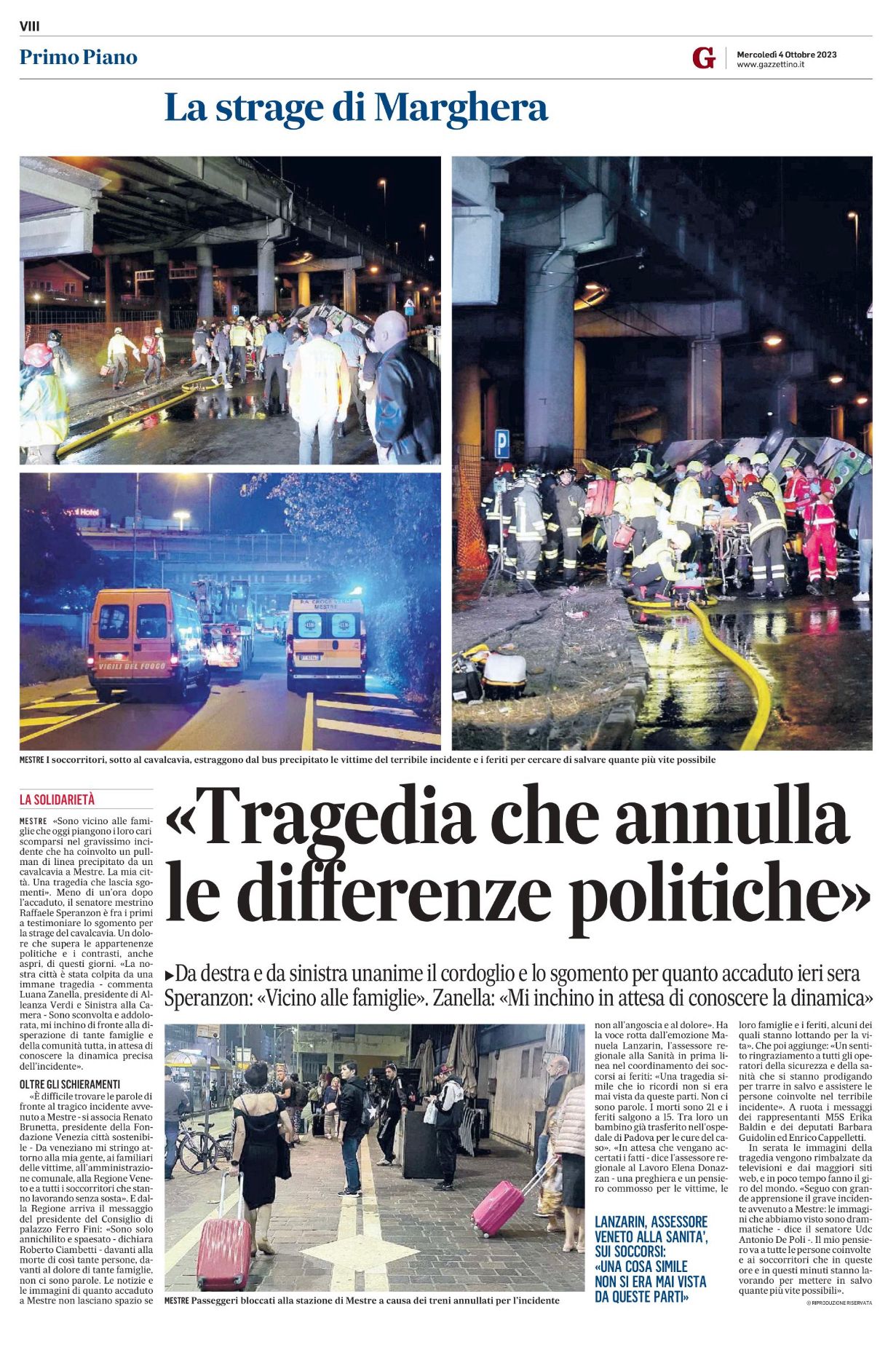 Vivissime condoglianze a tutte le famiglie delle vittime coinvolte nel disastro del cavalcavia ieri sera a Mestre. Giusto che il Sindaco Luigi Brugnaro dichiari il lutto cittadino. Grazie a tutti i soccorritori sul campo, a tutto il personale degli ospedali coinvolti, che ha ricevuto uno straordinario carico di dolore e di lavoro di elevato impegno professionale. Nei momenti drammatici, come sempre, entrano in scena i vigili del fuoco, le ambulanze, le forze dell’ordine, i volontari della Protezione Civile e tutto il personale degli ospedali che ricevono e curano le vittime. Loro in questi momenti ci sono sempre con il loro impegno e la loro dedizione al dovere. Ringraziamoli per quello che hanno scelto di fare nella vita: questi e solo questi sono i corretti esempi per i più giovani, le persone con i più elevati ideali, quelli che contemplano altruismo e solidarietà, per la salvezza della nostra e di tutte le comunità.