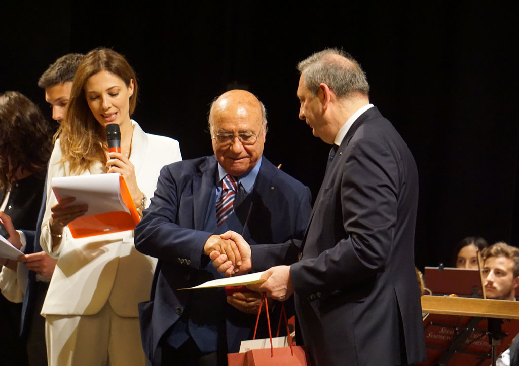Nella foto il dottor Gravili con il presidente Leoni sul palco del Teatro Goldoni il 19 ottobre 2019 alla Giornata del Medico e dell'Odontoiatra